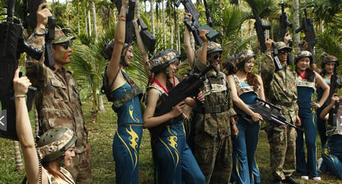 正在海南三亞參加美麗之冠2014世界休閑小姐大賽中國年度總決賽的佳麗,身穿迷彩手持激光槍體驗真人CS訓(xùn)練。北京時間12月28日,正在海南三亞參加美麗之冠2014世界休閑小姐大賽中國年度總決賽的佳麗,身穿迷彩服,手持銘恒科技公司生產(chǎn)的真人CS裝備,在熱帶叢林中進行真人CS激光野戰(zhàn),場面激烈,佳麗們個個身手敏捷,巾幗不讓須眉,打出了水平,秀出了風(fēng)彩,體驗真人CS環(huán)節(jié)成為本次美麗之冠2014世界休閑小姐大賽最出彩的一環(huán),中新網(wǎng)等眾多媒體現(xiàn)場追蹤采訪。